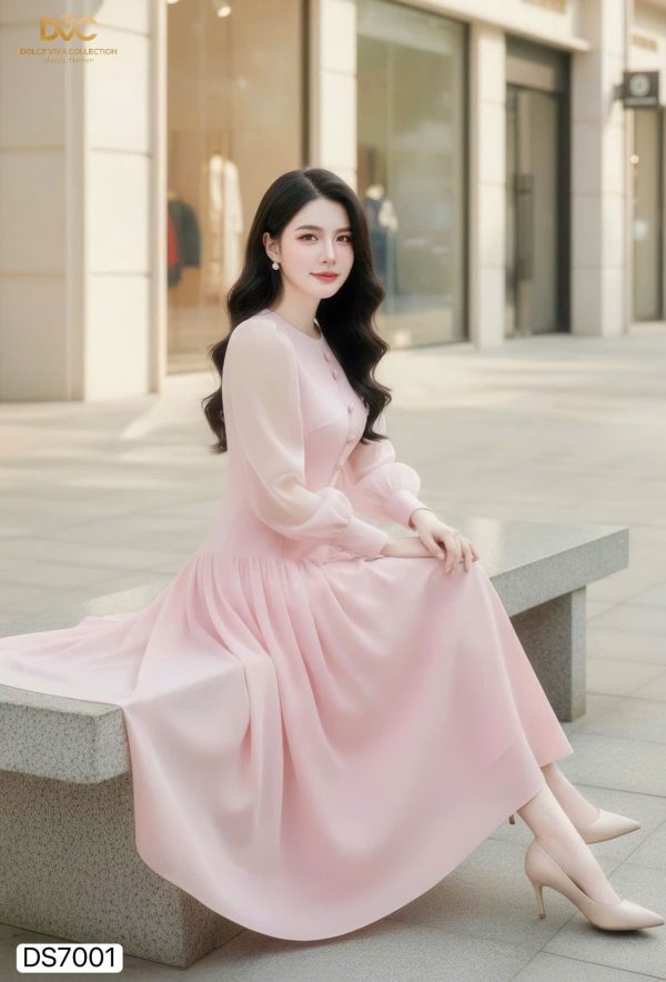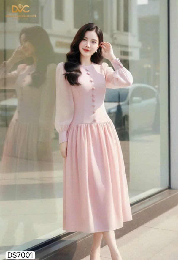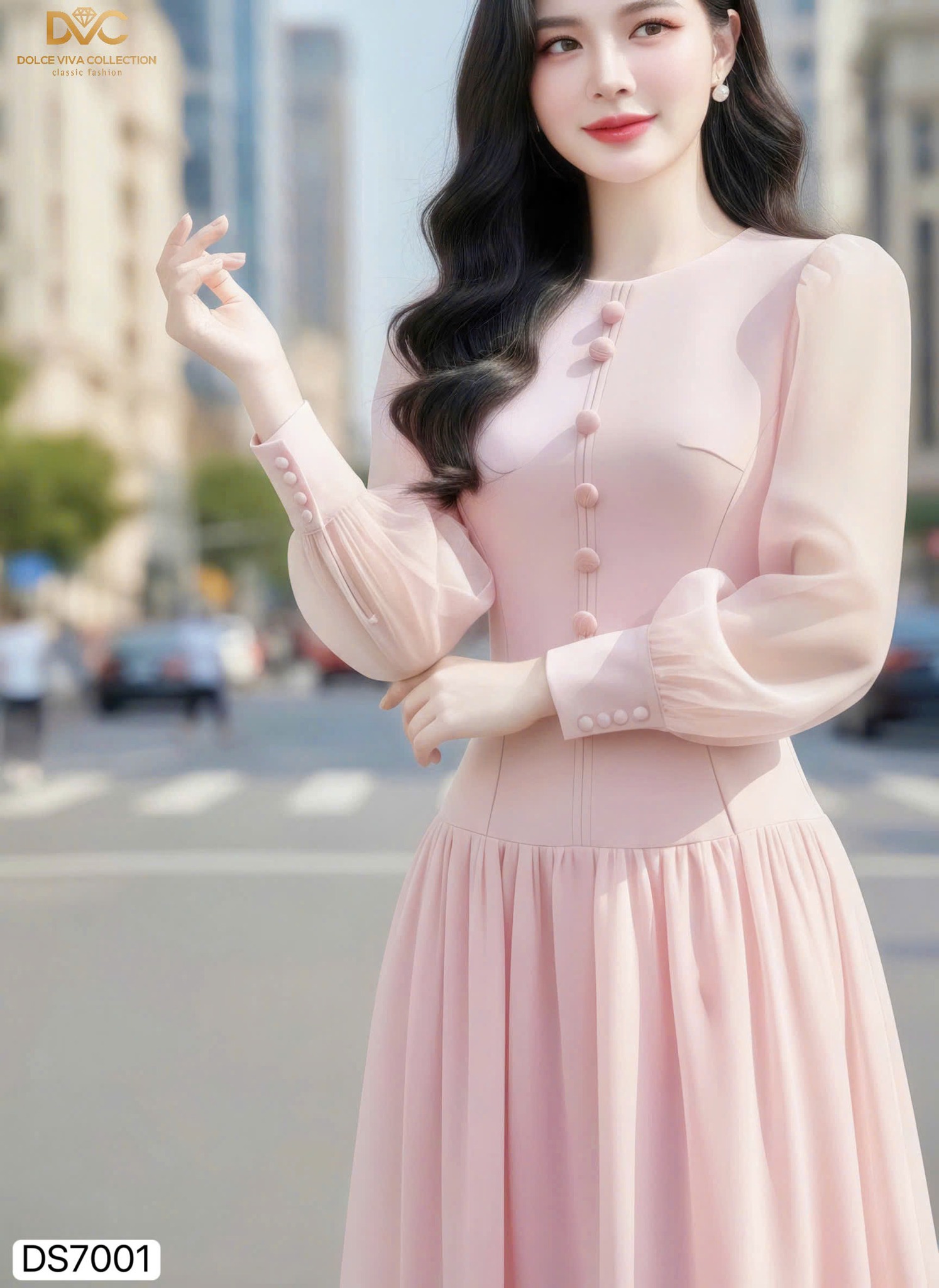 🌟 Highlights: Puffed long sleeves, fabric-covered buttons, waist-enhancing silhouette