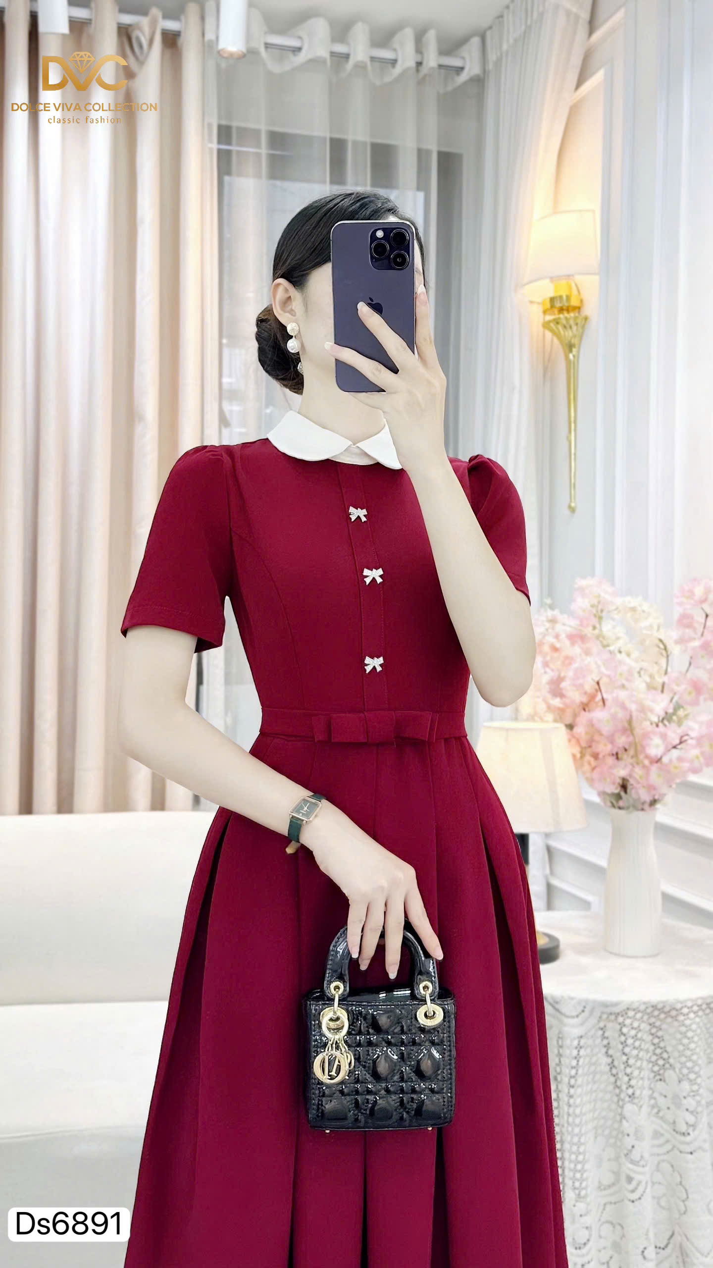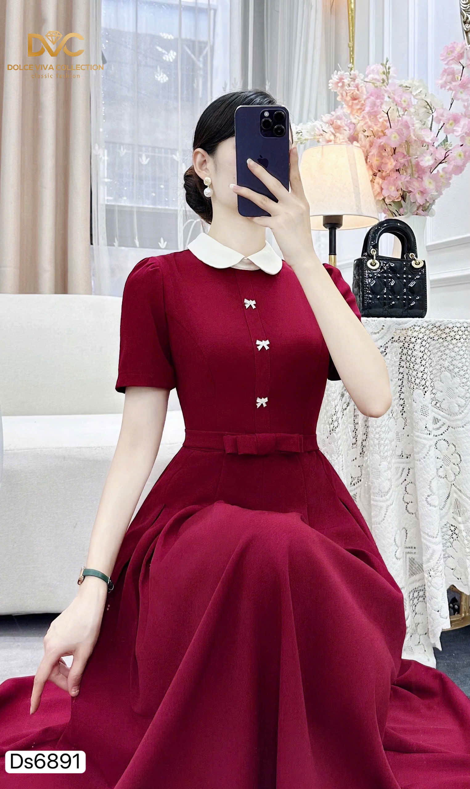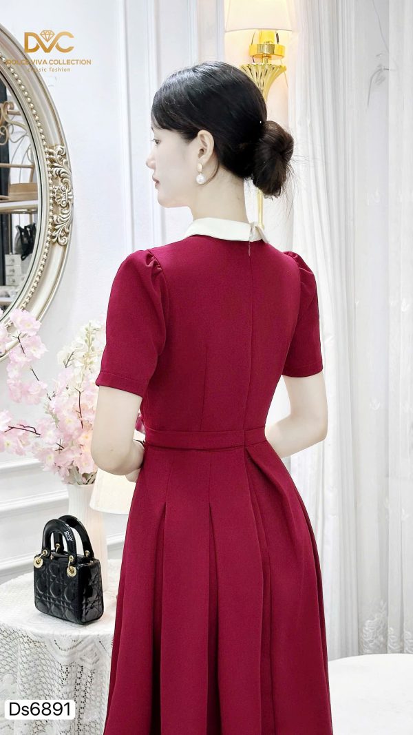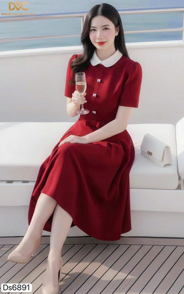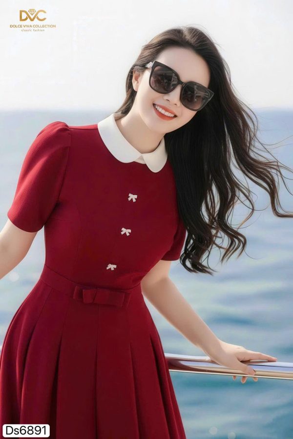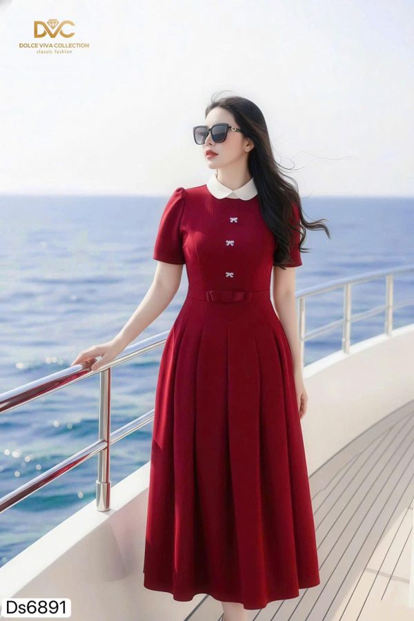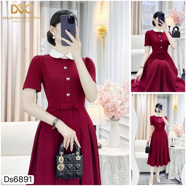 🌟 Highlights: White Peter Pan collar, pearl-bow button details, midi flare design that flatters the figure