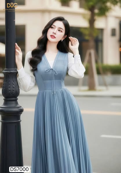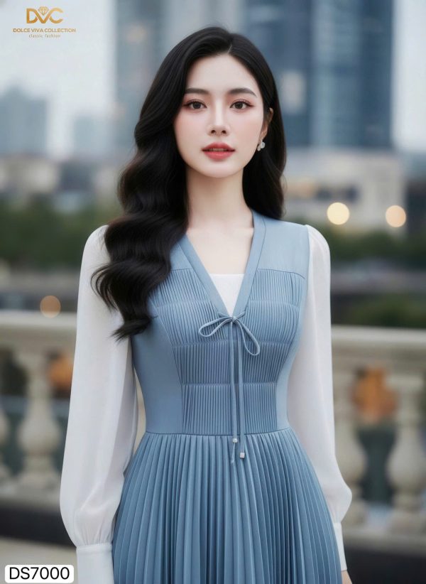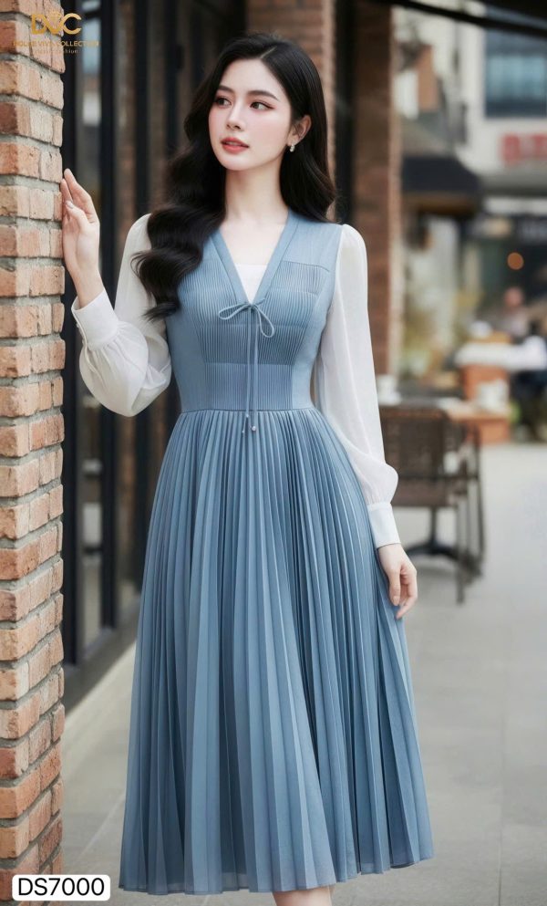💎 DS7000 – A gentle expression of modern elegance. Featuring a shirt-style top with long sleeves and a softly pleated skirt, this pastel blue dress brings effortless sophistication to your everyday look. Made from premium soft fabric that holds its shape beautifully — perfect for work, casual outings, or capturing timeless moments. Shop now – limited stock available.