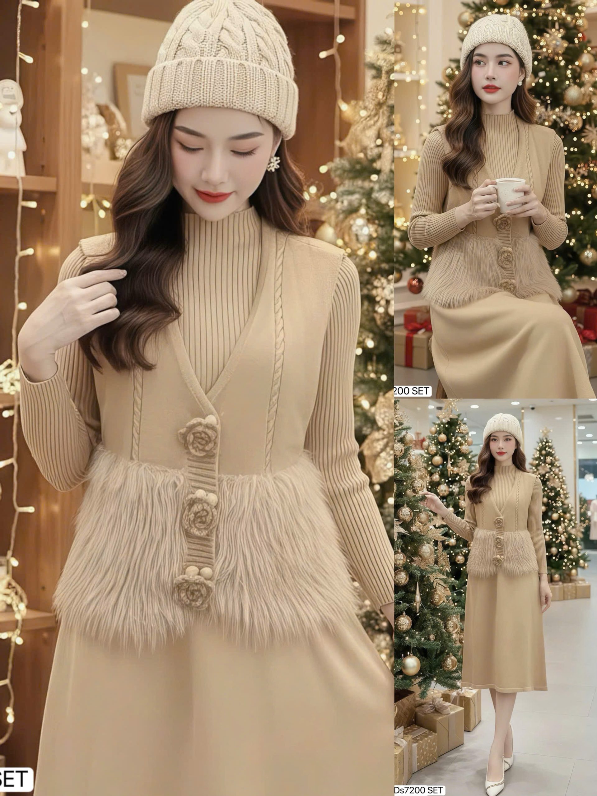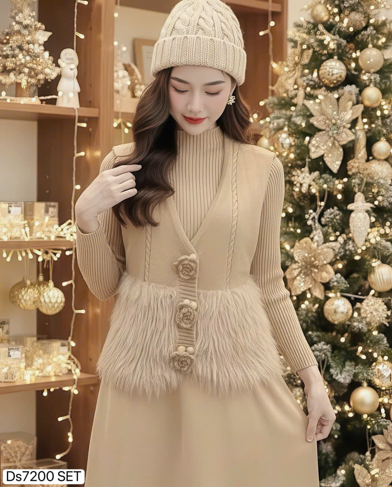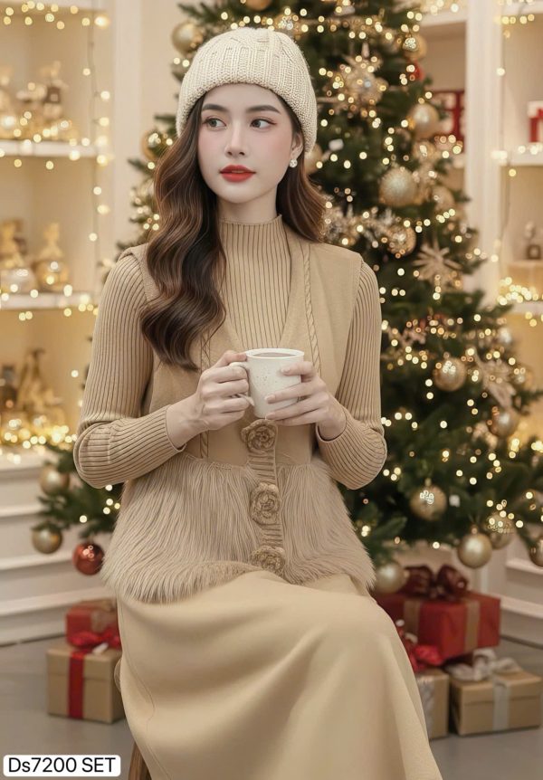 Featuring a fitted high-neck knit top layered with a luxurious faux-fur gilet adorned with handmade floral accents, paired with a gentle A-line skirt that flatters every silhouette.