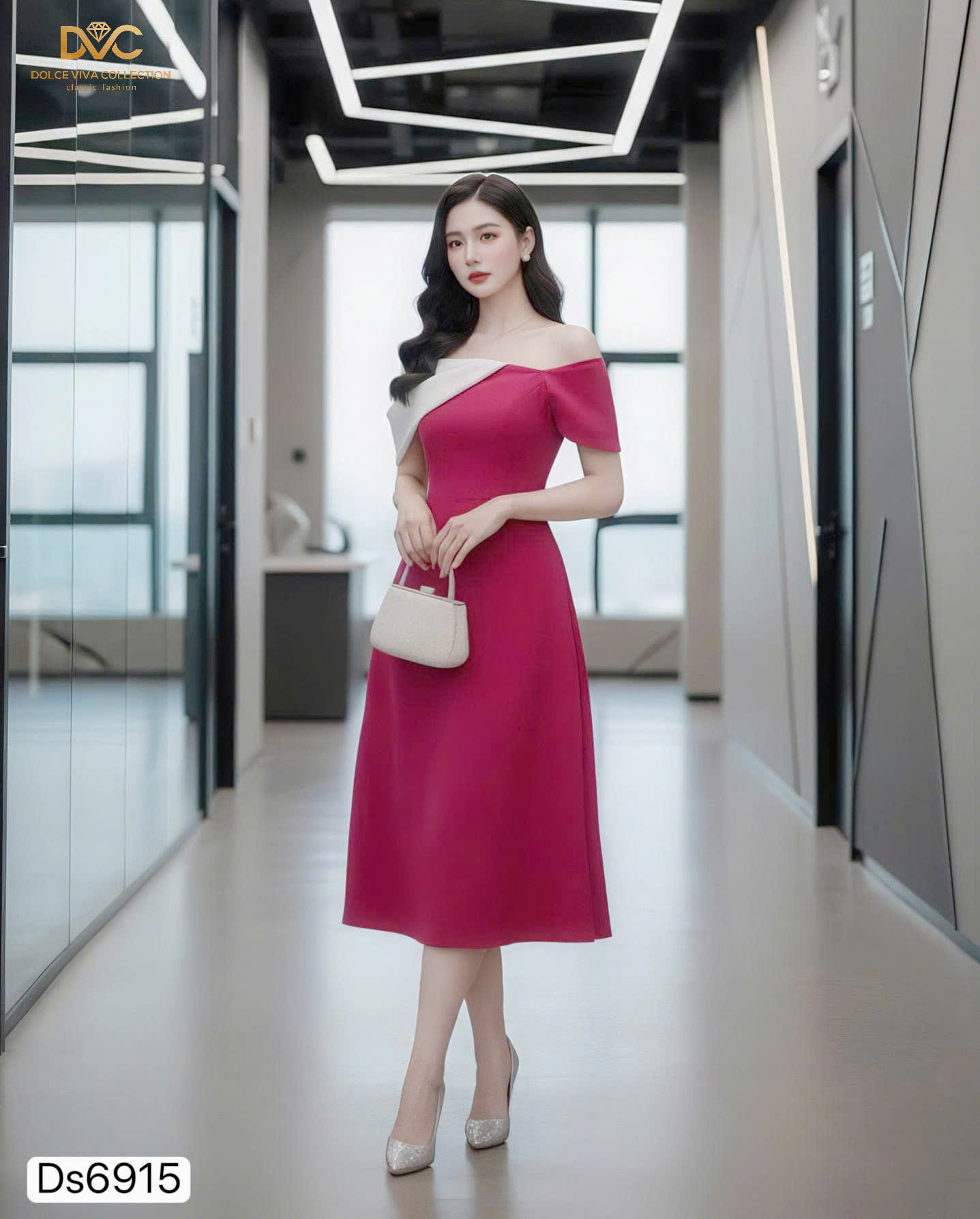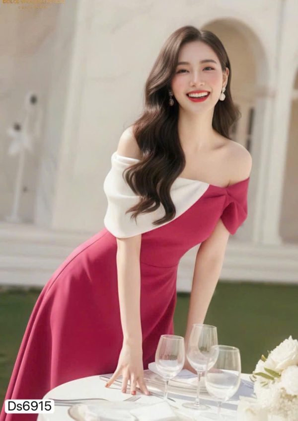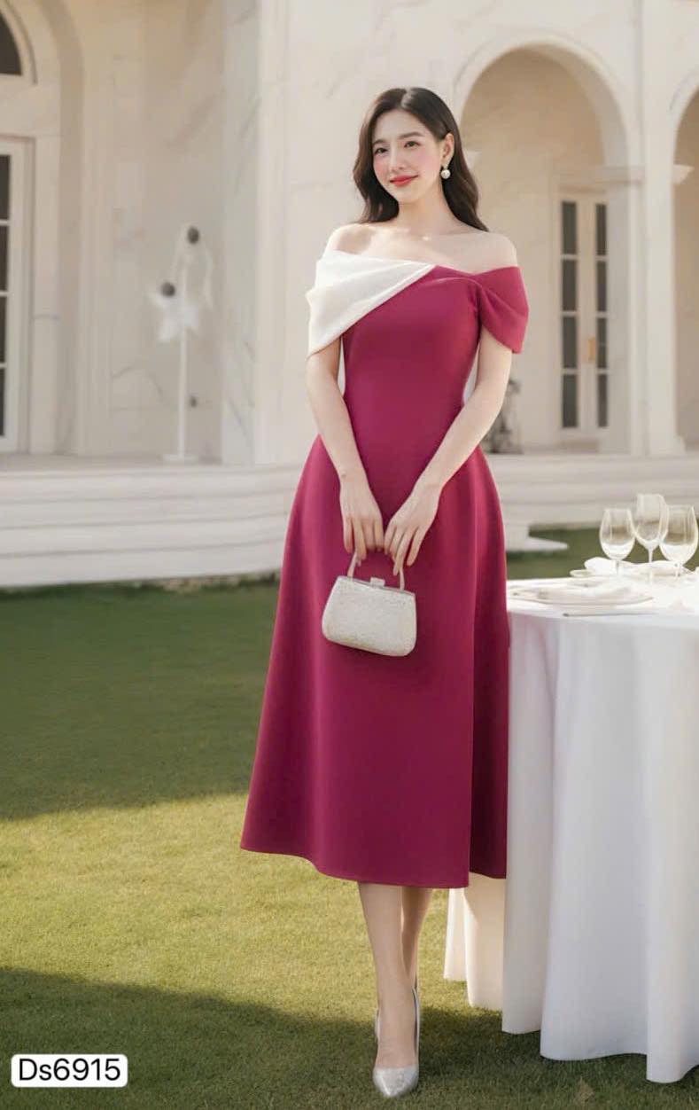 🌸 Highlights: Off-shoulder asymmetric neckline, fitted waist, A-line skirt