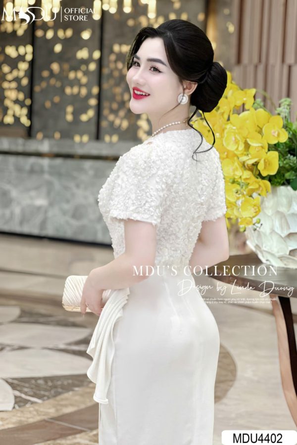 Fabric: Embossed floral lace (top) & satin silk (skirt) – structured, luxurious, and graceful