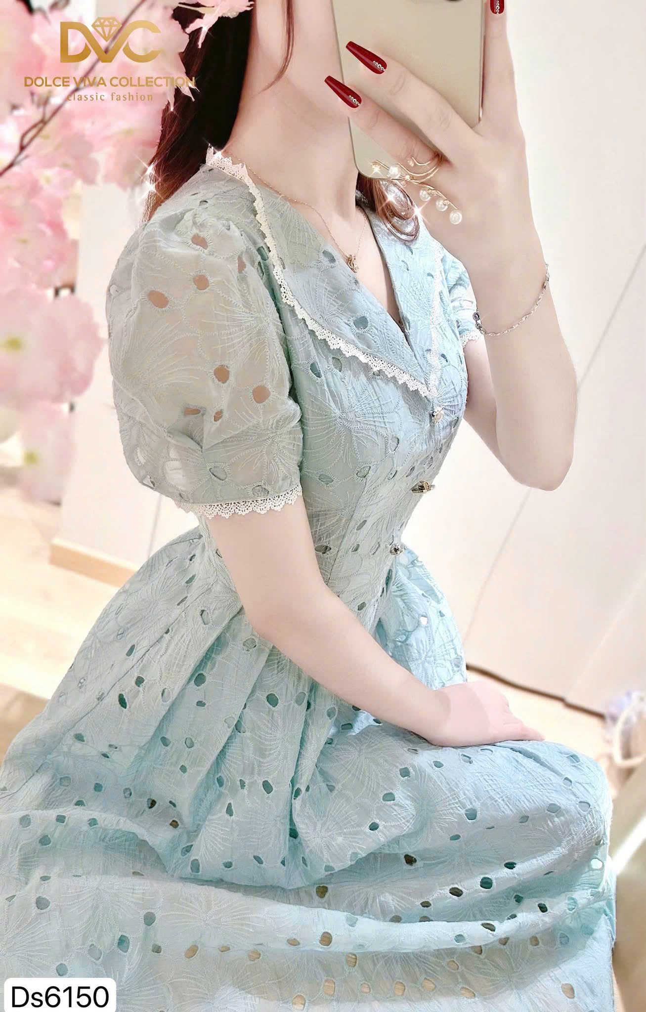 The scalloped lace-trimmed collar, pearl buttons, and gently puffed sleeves evoke timeless charm. With a softly pleated skirt and tailored waistline, this piece subtly sculpts the figure and adds an air of refined femininity.