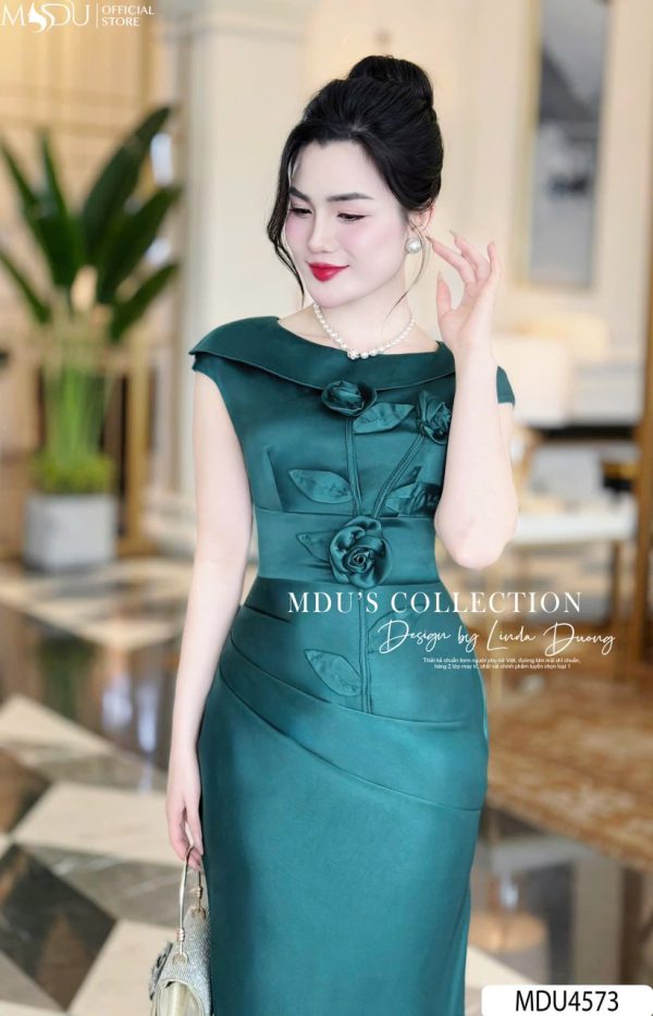 Highlights: Classic off with beautiful floral detailing at the waist, which adds a feminine touch. The dress features a flattering, figure-hugging fit, with a sleek A-line silhouette that creates an effortlessly elegant look.