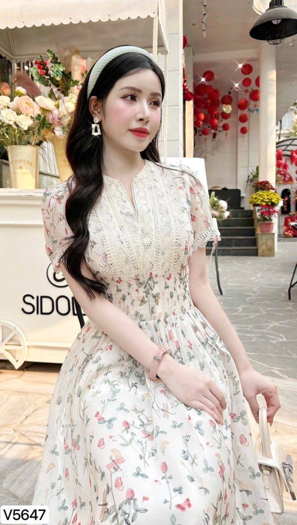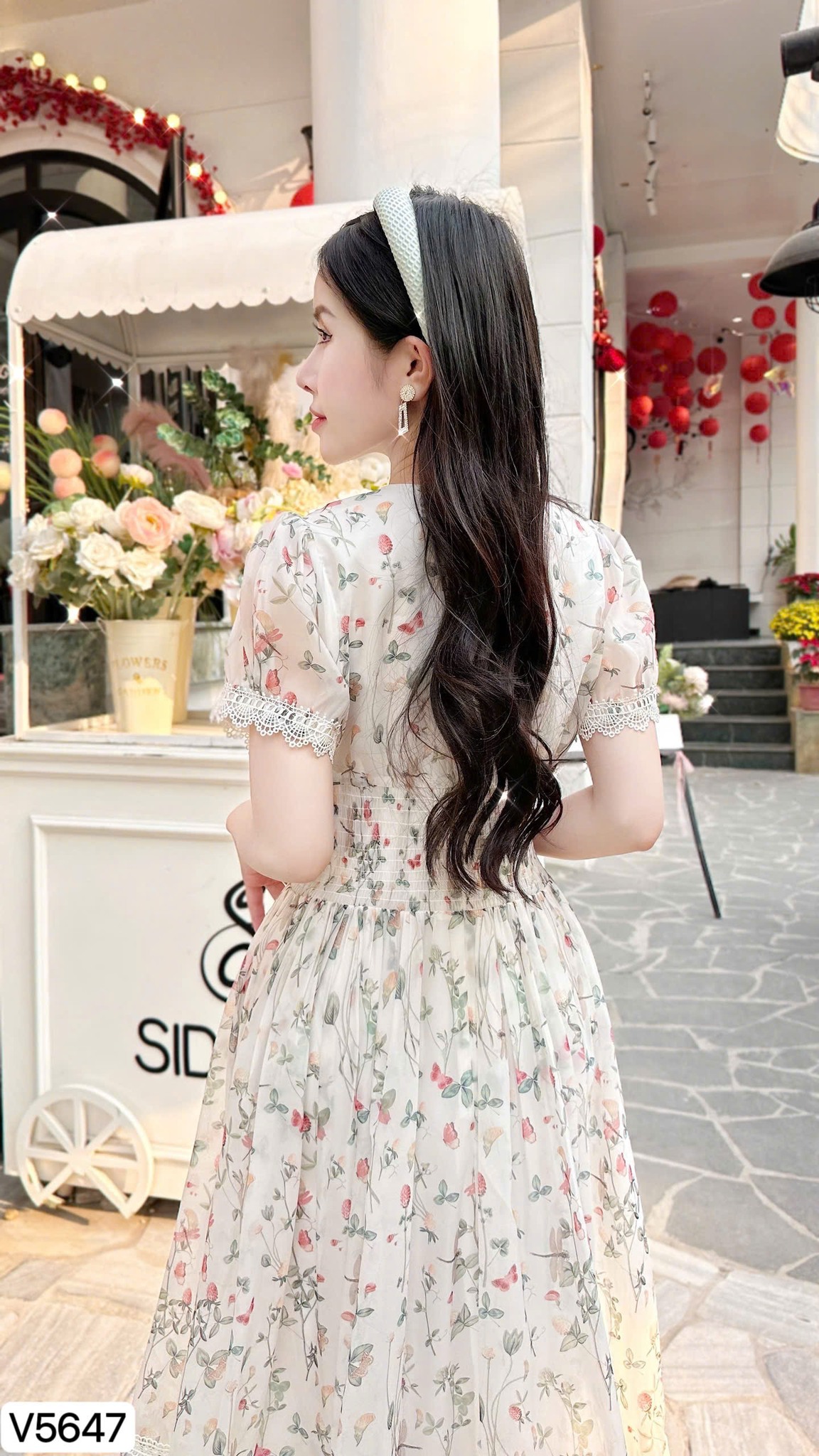 Design Highlights: Lace-detailed bodice, soft puff sleeves, smocked waist for comfort, romantic floral print, midi hem with ruffled edge and lace trim
