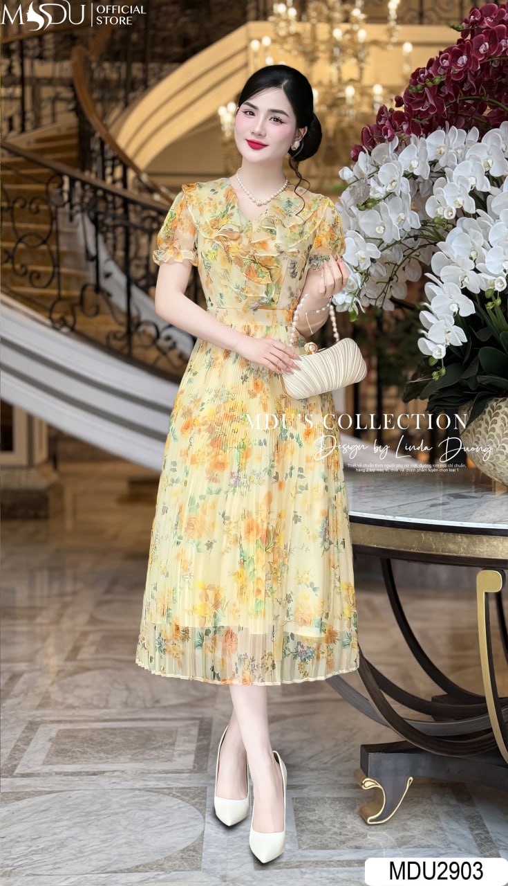 Highlights: V-neckline with delicate ruffled details, Pleated skirt for graceful movement, Feminine floral print in soft yellow and pastel hues, Short sleeves for a balanced silhouette