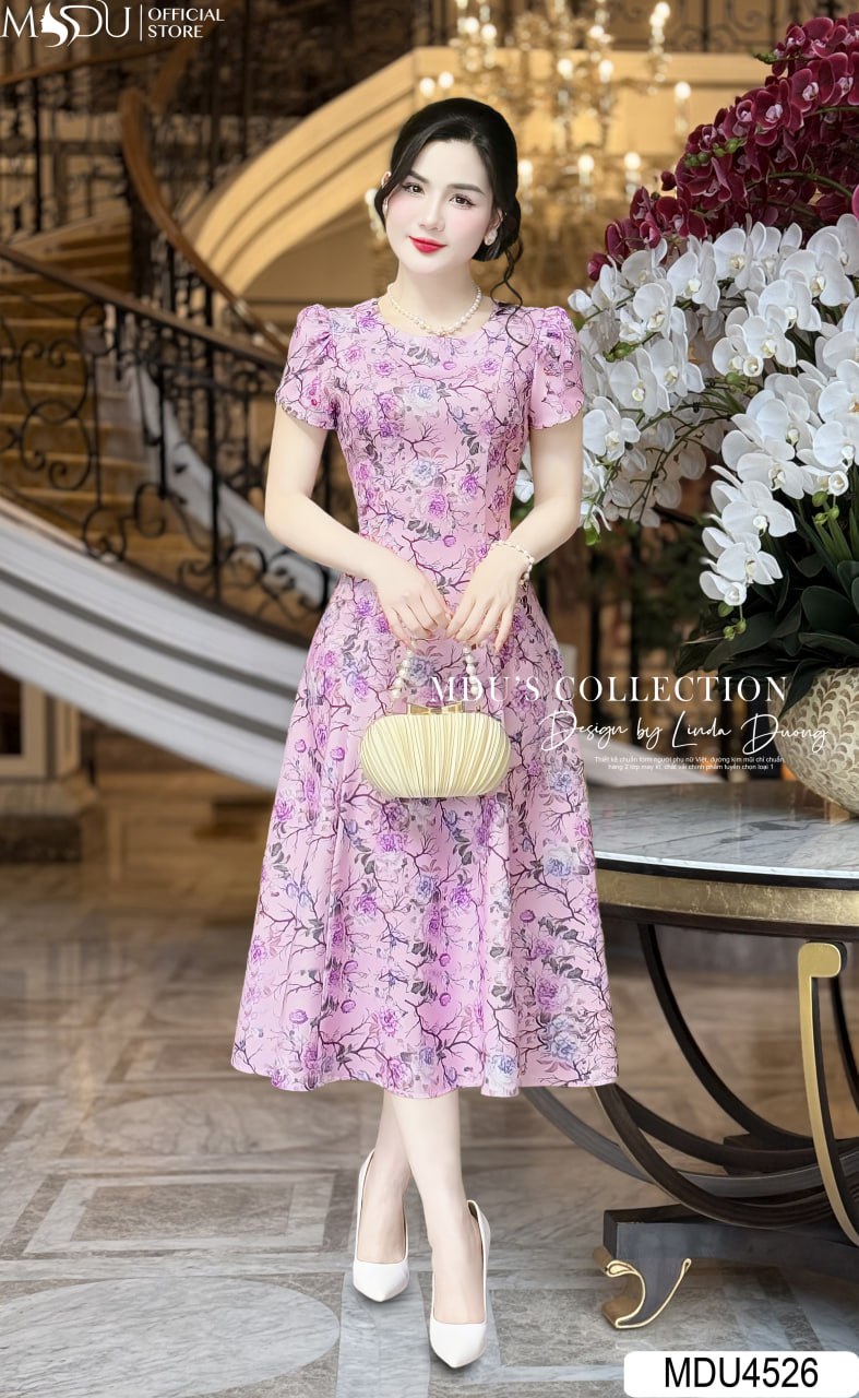 Highlights: Feminine round neckline, Short puffed sleeves for a soft, elegant silhouette, A-line skirt for graceful movement, Vibrant floral print in shades of pink and purple