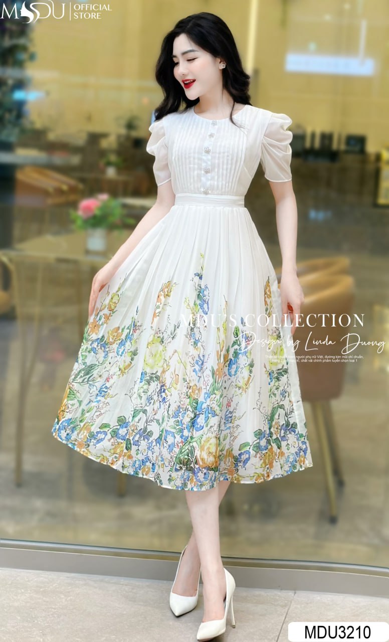Highlights: Flattering round neckline, Puff short sleeves, Button-down bodice, Pleated skirt with a vibrant floral print at the hem