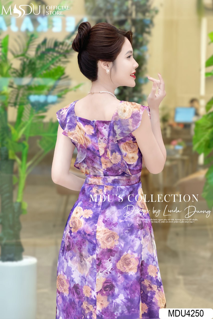 Highlights: Elegant V-neckline with button-down front, Ruffled cap sleeves for added femininity, Fitted bodice that transitions into a flowing A-line skirt, Vibrant purple floral print with a watercolor effect