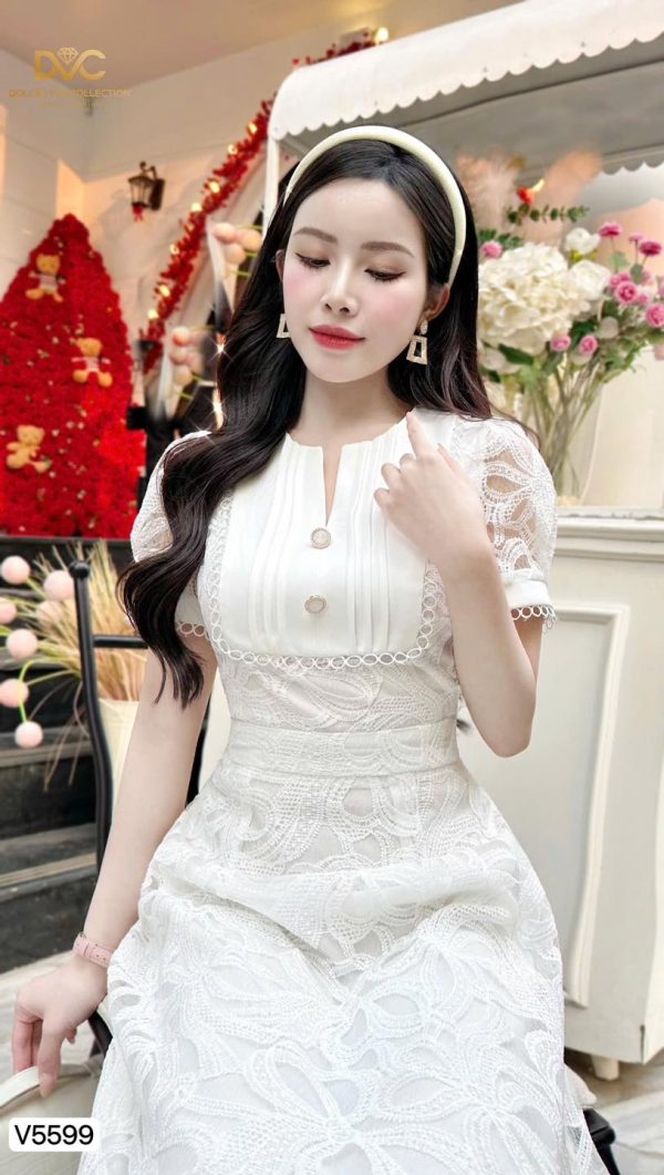 V5599 – A vision of pristine elegance. Featuring a pleated pearl-detailed bodice and a layered lace skirt, this dress is perfect for romantic dates, chic garden parties, or refined occasions. Let your beauty shine effortlessly.