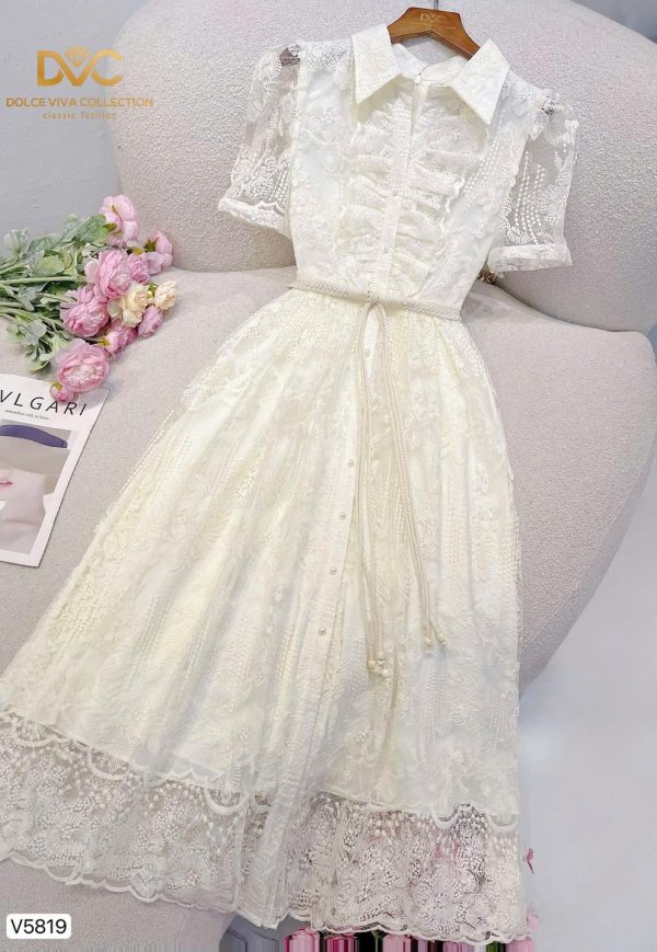 Highlights: Shirt collar, short sheer sleeves, full-length lace skirt, adjustable rope belt