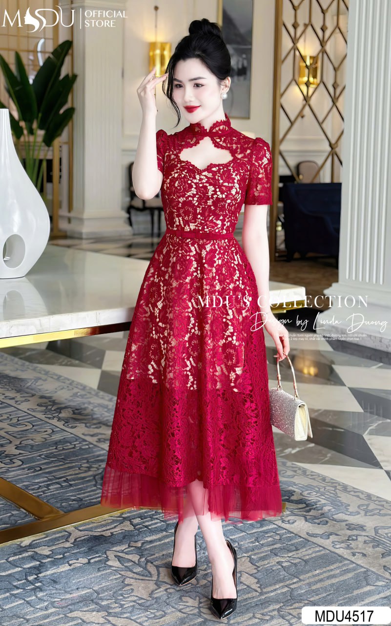 Highlights: Featuring a high lace neckline with an elegant cutout detail, the dress exudes charm and grace. The flowy skirt and figure-flattering silhouette are complemented by the delicate lacework, making this dress perfect for upscale events or evening soirées.