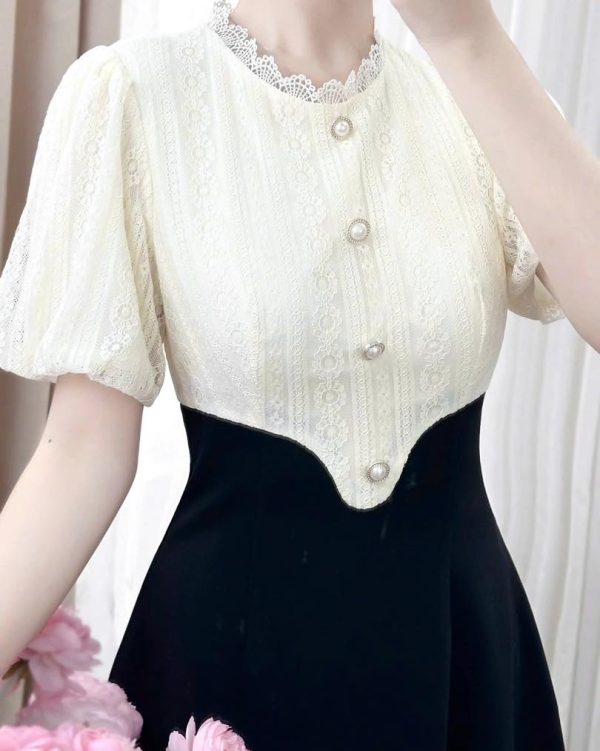 Highlights: Vintage pearl-button top, sculpted waist cut with hourglass illusion, puff sleeves, delicate neckline lace trim
