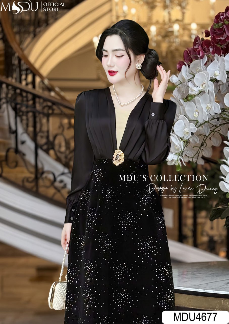 Highlights: Deep V pleated bodice, Long sheer with button cuffs, Velvet skirt embellished with shimmering crystal dots, Gold-accented waist brooch