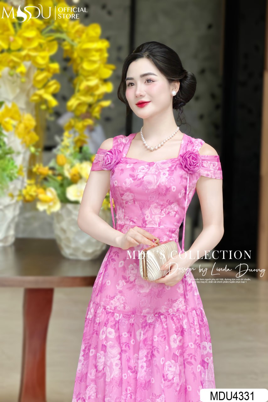 Highlights: Elegant flared silhouette, Cold-shoulder straps with 3D floral appliqués, Romantic pink floral print