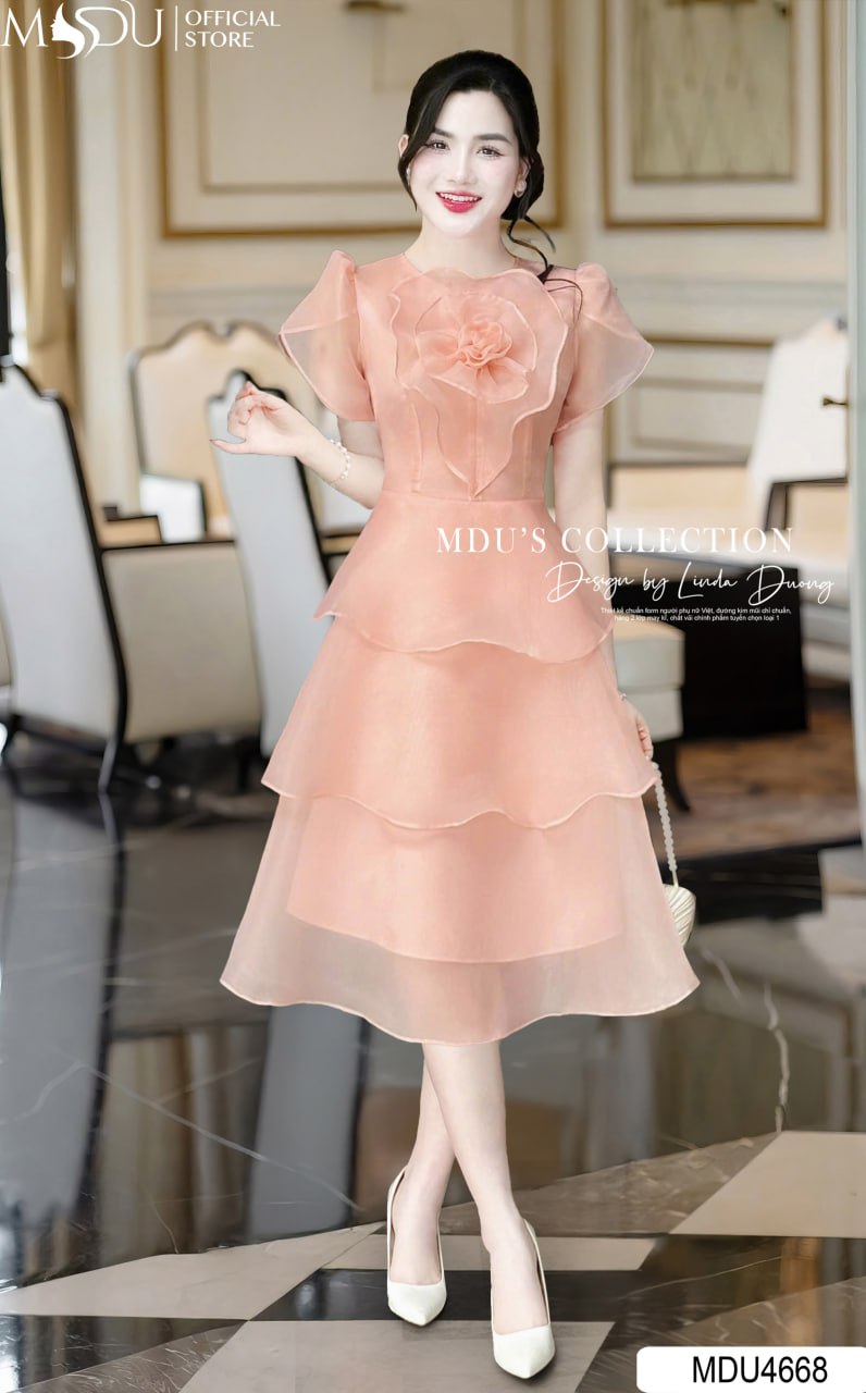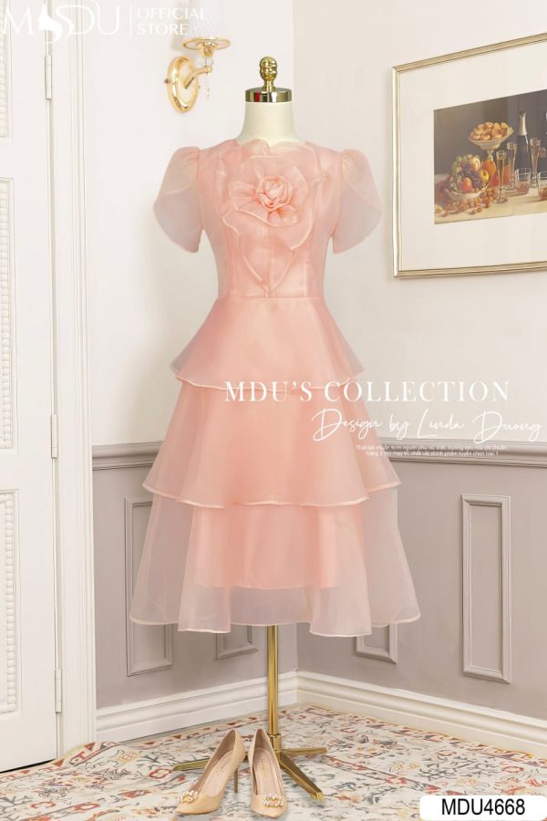Điểm nổi bật của thiết kế: Chiếc váy có phần chân váy xếp tầng lãng mạn với nhiều lớp mềm mại, bồng bềnh tạo nên chuyển động duyên dáng. Điểm nhấn hoa thủ công 3D ở thân váy tạo điểm nhấn quyến rũ, trong khi tay áo bồng bềnh tinh tế tôn lên vóc dáng nữ tính. Tông màu đào pastel toát lên vẻ thanh lịch nhẹ nhàng, mơ mộng hoàn hảo cho những dịp đặc biệt.